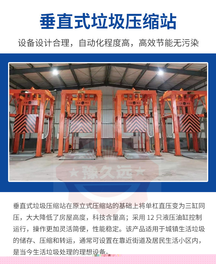 垂直式垃圾壓縮設備在原立式壓縮站的基礎上將單杠直壓變為三缸同壓,大大降低了房屋高度,科技含量高;采用12只液壓油缸控制運行,操作更加靈活簡便,性能穩定。該產品適用于城鎮生活垃圾的儲存、壓縮和轉運,通常可設置在靠近街道及居民生活小區內,是當今生活垃圾處理的理想設備。