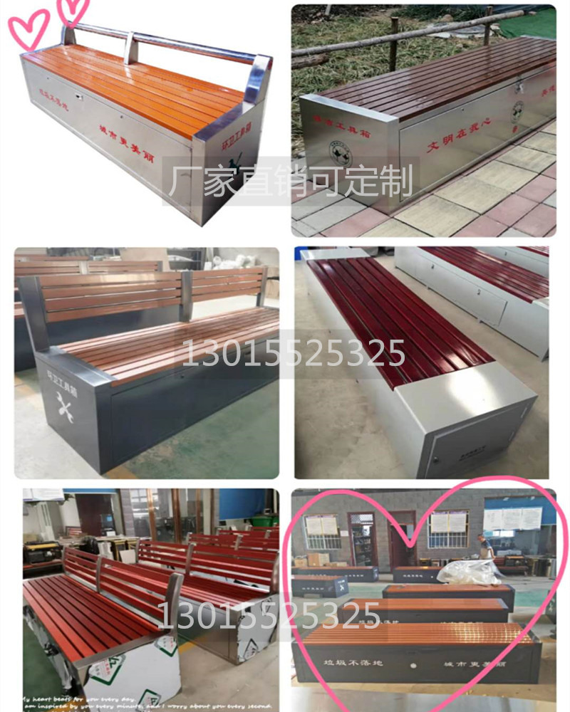 環衛工具箱:也叫保潔員工具箱,環衛工具椅,保潔員休息座椅,市政保潔箱等。工具箱常用尺寸為:長2400*寬500*高550mm,也可以做成2米,2.4米,2.7米等,寬度和高度也可以定做,滿足不同客戶、不同場所的使用要求。